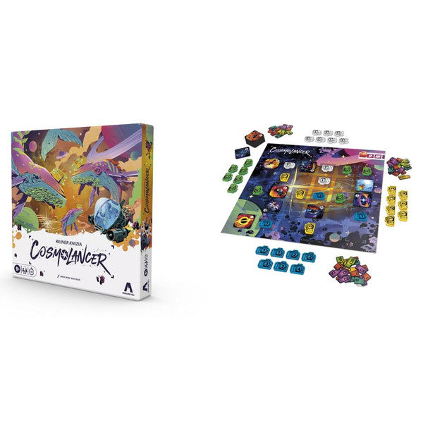 Congratulations, you’ve landed your first gig as a freelance space photographer—a Cosmolancer! Take to the stars in the Cosmolancer game, a galactic reimagining of the Kingdoms game by Reiner Knizia set in a fantastical galaxy of Imposing Squids and Galactic Hounds. In this highly competitive tile placement game, try to collect the most Interstellar Credits by strategically placing Photo Op tiles and Imaging Devices on the board. But stay alert for cosmic dangers that can sabotage your shots! Earn the most Interstellar Credits over 3 rounds to win. The new game features custom artwork by Hugo Cuellar and Charlie Layton. Includes 1 Gameboard, 22 Cardboard tiles, 41 Wooden tokens, 94 Cardboard Interstellar Credits, and 1 Rulebook.