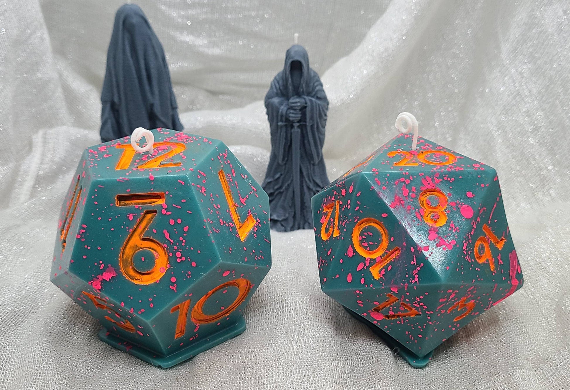 Candles for gamers! These dice candles sport black-light reflective numbers. To add to the cool gamer vibe, the finished candle is then spattered in black-light glow. The D12 is 11oz and the D20 is 10oz. Each one gives 35-40 hours of burn time. Made to order. Each candle is unique and may not be the same as shown in the images. Cases are pulled from the categories below (example scents shown).